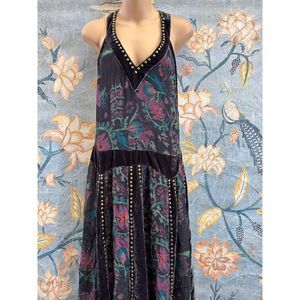 Stand out in this stunning maxi dress featured in a drapey, dropped silhouette with vintage-inspired printing and rivet-adorned trim for added effortless edge.