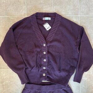 Cozy and stylish cardigan and pant set. Deep purple hue. Button-up front. Perfect for layering.