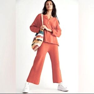 FP Beach collection waffle knit fabrication slouchy Henley top high-rise, wide-leg pants relaxed look.