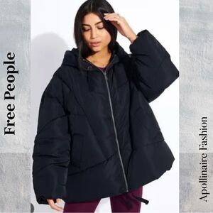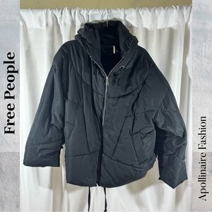 Stylish black puffer jacket by Free People. Features a cozy design with a front zipper.