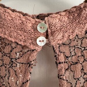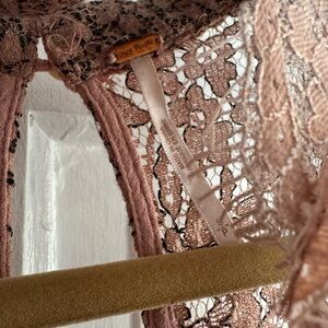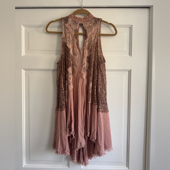 Chic backless dress with lace overlay. Soft pink and brown tones. Perfect for stylish outings.