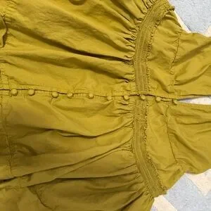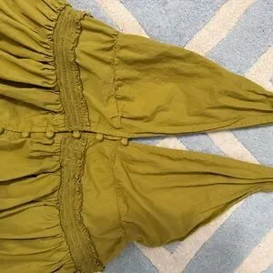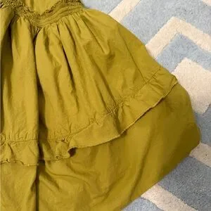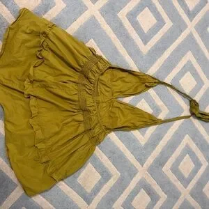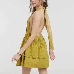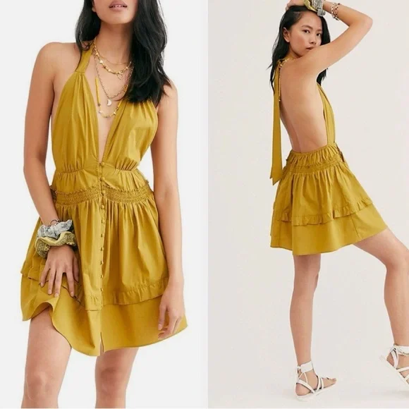 Flirty halter mini dress in a mustard yellow shade. Deep V neckline with a gathered waist for a flattering silhouette. Lightweight, tiered skirt with button-front detail. Perfect for warm-weather outings and casual events.