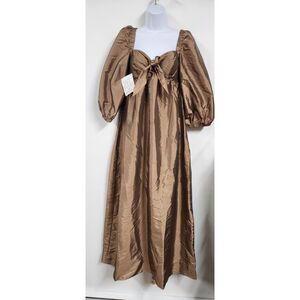 So bold and beautiful, this maxi is featured in a shiny fabrication and shapeless silhouette with adjustable tie-front detailing and puff-inspired sleeves.