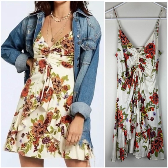 Free People Happy Heart Floral Mini Dress Ruched Ruffle size Small
