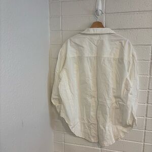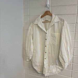 Classic and versatile button-down top featured in a boxy & oversized silhouette with dropped puff sleeves and curved bottom hem for added shape.