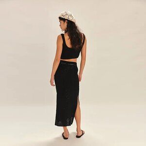 Features: Semi-sheer knit fabrication; Top: Cropped, square neckline; Skirt: Mid-rise, midi length, column style, side slit for movement