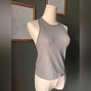 Elevate your wardrobe with this chic gray sleeveless top. Perfect for any occasion, it offers a sleek and modern look.