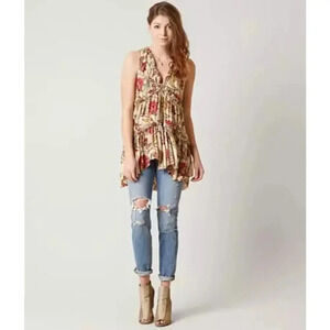 Free People Haze Bird Floral Printed Ruffle Trim Boho Tunic Top Size XS