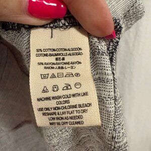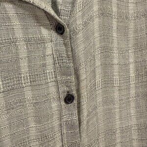 Semi-sheer gauze style blouse in gray and black with small ruffle accents at the shoulders. Perfect for a chic, casual look. Good condition and ideal for layering or wearing alone. • Button-up design • Gray and black color • Semi-sheer gauze style • Small ruffle accents at shoulders • Good condition Size: Womens S Condition: Pre-Owned Good