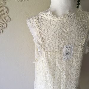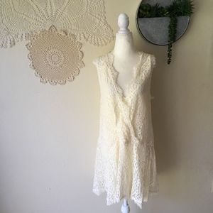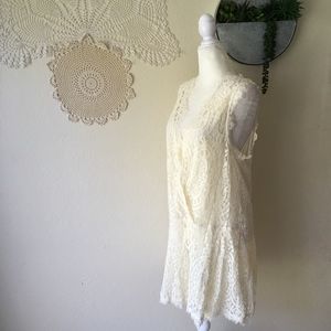 Free People Heart in Two white lace mini dress. Sweet and feminine sleeveless lace mini dress from Free People. Fringe eyelash lace with a plunging v-neckline and sheer back. Drop waist that flares out towards the bottom with a babydoll fit. Comes with removable white slip/lining. NWT. Size Medium. Measurements are taken with the item lying flat and are as follows: