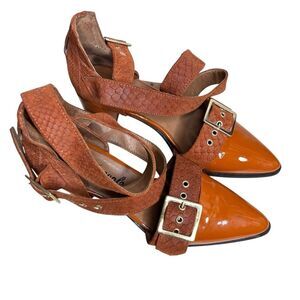 Free People Top Down Heel. Russet Brown Patent leather block heel Pointed Toe Ankle Wrap Block Heel.