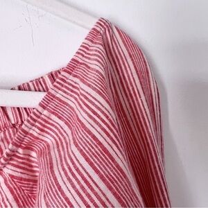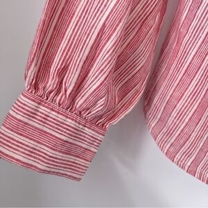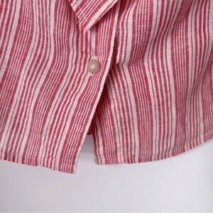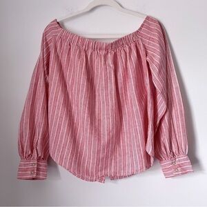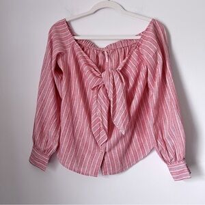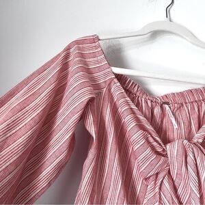 Free People Hello There Beautiful Linen / Cotton Off Shoulder in a Red Cream Stripe, Button Up with a large Necktie, Long Cuffed Sleeves, Elasticated Back for Fit, Relaxed and Lightweight Top. A twist on a classic button-up shirt. Style#: OB767675