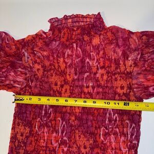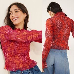 Free People Hello There sheer ruched mock-neck top red orange mesh medium