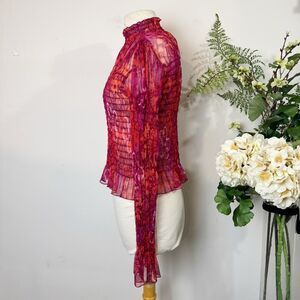A vibrant, weightless shimmer runs through this sheer, micro-pleated silhouette, giving it that signature Free People movement and ease. The ruffled cuffs and hem add a floaty finish that feels playful yet polished. Wear it with high-rise denim for an effortless daytime look, or layer it under a slip dress for a bold night-out moment. Perfect for anyone building a fun, standout capsule with statement tops.