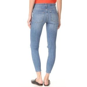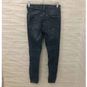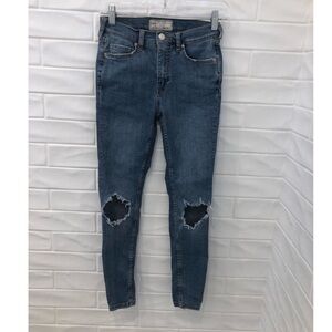 Free People's high-rise skinny jeans take a ripped look the the max with completely cutout knees. The free people high rise busted knee skinny jeans feature frayed holes at the knees which lend a well-worn feel to these soft, faded, distressed light wash skinny denim pants. These skinny jeans are shaped by perfectly stretchy denim with a high-waisted fit, belt loops, and five pocket cut. Skinny pant legs with distressed knees. Branded top button and hidden zip fly.
