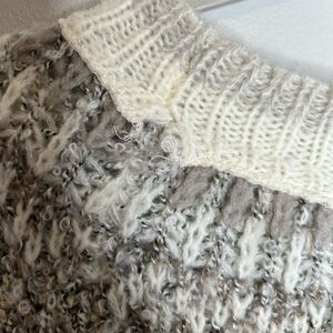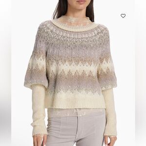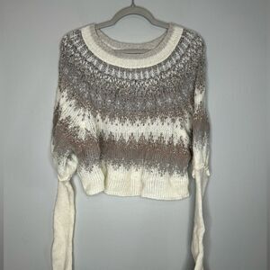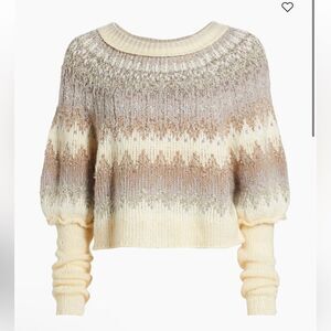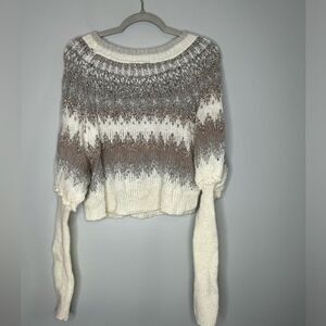 Size medium. Stitch had come apart at the back neck( shown in pic). Cut in a cropped silhouette, the knit Home For The Holidays sweater from Free People is elevated by balloon sleeves and a woven, colorblocked pattern.