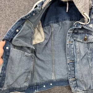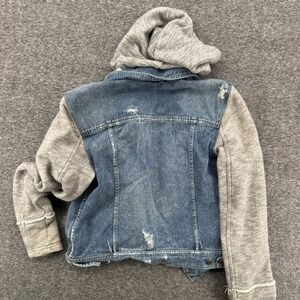 Mixed-media denim jacket pairs a classic medium wash distressed denim vest body with cozy heathered grey knit sleeves and a matching drawstring hood. Designed with a button-front closure, functional chest flap pockets, and side welt pockets, this versatile layer offers a relaxed, lived-in feel. The denim features intentional distressing and fraying throughout, while the knit components provide the comfort of a favorite hoodie. Perfect for festival season or casual everyday layering.