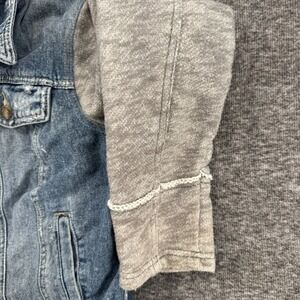 Free People Hooded Denim Jacket Blue Distressed Mixed Media Knit Sleeves Large