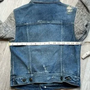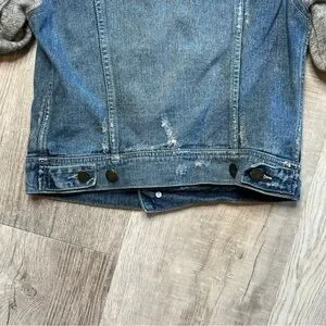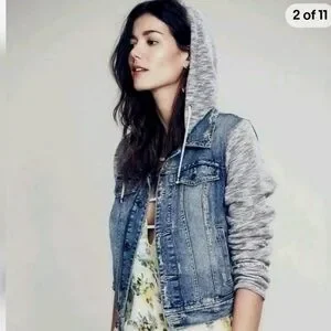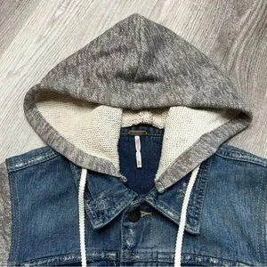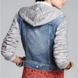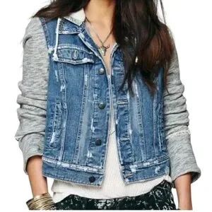 Stay effortlessly stylish with this Free People Hooded Denim Jacket, crafted from 100% cotton for a comfortable and breathable fit. This trendy distressed denim jacket features contrast gray sweatshirt sleeves and a removable hood, blending edgy and casual elements for a layered look without the bulk. The button-front closure, chest pockets, and classic trucker style make it perfect for year-round wear. Whether paired with a boho dress or casual jeans, this versatile piece adds a cool, laid-back vibe to any outfit.