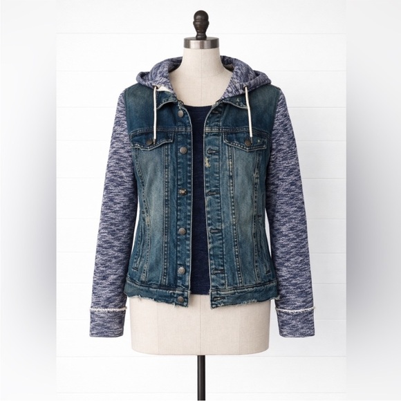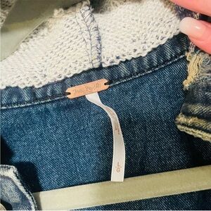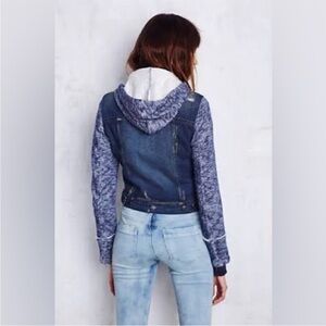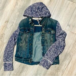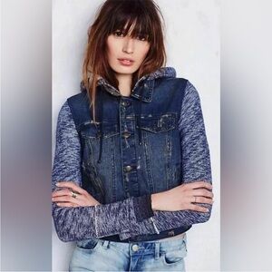 Free People - Hooded Jean Jacket - Sz L – Distressed Denim Knit Sleeves & Hood