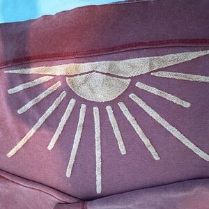 Over sized hoodie with really cool embroidery on the back. Has a small what looks like discoloration on front but really not noticeable (picture included). Runs super, super big.