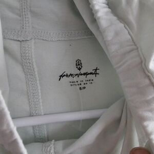 Features: Soft printed fabrication, high-neckline with hood, contrast-colored seams throughout, side-slit detail at hemline, thumbholes at both wrists