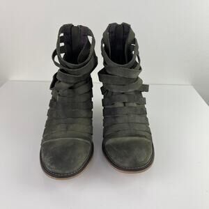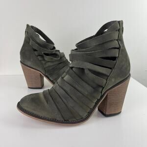 Free People Hybrid Gray Green Leather Strappy Ankle Boots Wood Heel 38 7.5/8