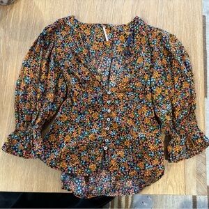 Gorgeous blooms bring romance to this breezy cotton blouse styled with ruffle trimmed puff sleeves and a shapely v neck