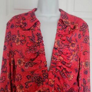 This blouse features a delicate floral design on a vibrant red background, complemented by ruched detailing at the front. With a tailored button-up style and long sleeves, it offers a blend of vintage charm and modern sophistication, making it a versatile addition to your wardrobe.