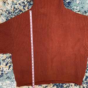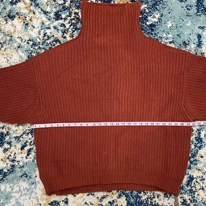 An oversized pullover sweater with turtleneck and dolman sleeves. Super cozy! Size small but if you see the measurements, can fit up to a size large!