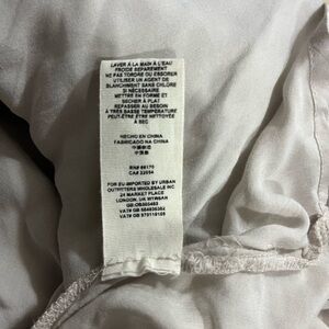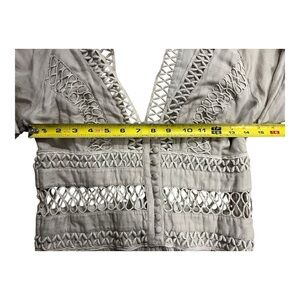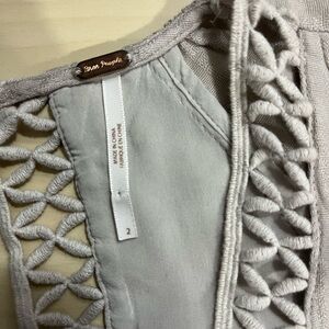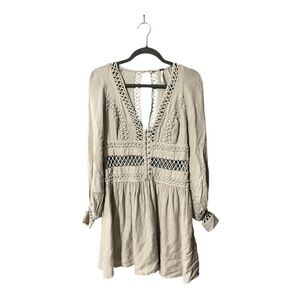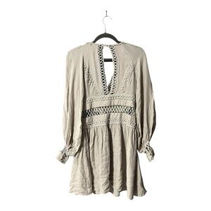 Free People I Think I Love You Crochet Inset Mini Dress in beige. Unleash your free-spirited style with this boho-style mini dress. This dress is made of soft woven fabric and is characterized by a crochet embroidery cut outs at the and a deep V-neck. The short bell sleeves and fabric-covered buttons underline the romantic flair.