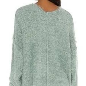 The sweater features a V neckline, Dolman long sleeves, center seam detail, relaxed fit and allover fuzzy finish.