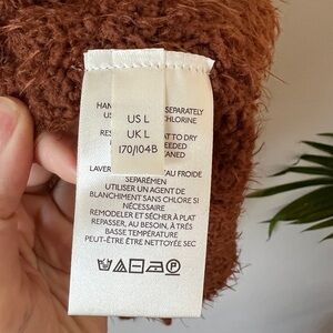 Pullover sweater by Free People, in size L. Oversized fit, V-neck. Chunky eyelash knit. Mocha Java color. Excellent bare used condition, no flaws or damage noted.