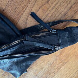 Features: Sling style, leather fabrication, U-shape design, adjustable shoulder strap, double zipper closure, interior zipper pocket