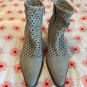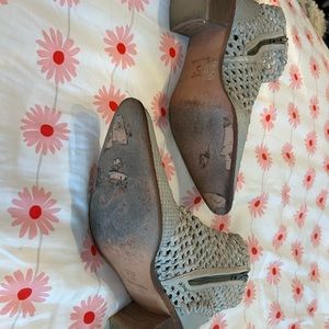Worn a few times, but overall fantastic condition. Only sign of wear is on the bottom of the shoes as shown and reflected in price. Very comfortable. Pointed toe which adds uniqueness. Woven dove grey leather. Size 40. Fits size 9 1/2 - 10