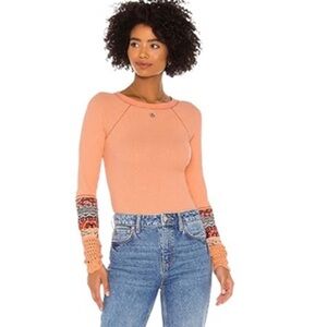 Free People In The Mix Thermal Cuff Tee Rio Orange Long Sleeve Boho Top L