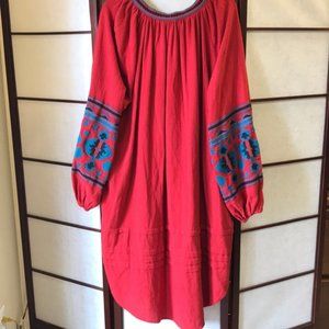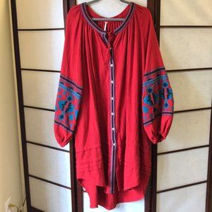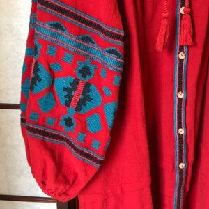 This dress gives major Vita Kin vibes! In an oversized silhouette, this boho midi tunic features button closures down the front, beautiful embroidery detailing on the long balloon sleeves, and pockets at hips.