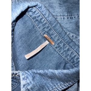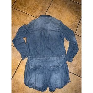 Chic denim romper with button-up design. Features long sleeves and chest pockets. Relaxed and stylish fit.
