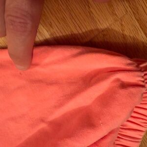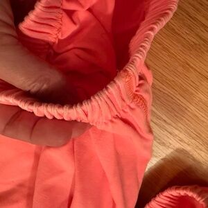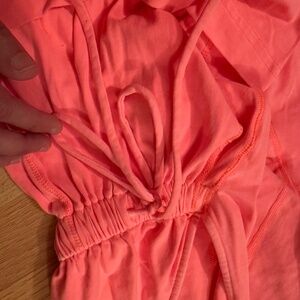Effortless playful style. Such cute details with ties and pockets. So comfortable and breezy for summer but can wear a top under or over for warmth in any season. Statement color in “neon coral”