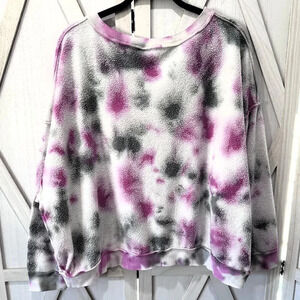 Lounge out in this so comfy fuzzy slouchy sweatshirt featured in a washed tie-dye design.