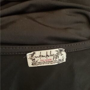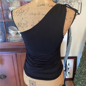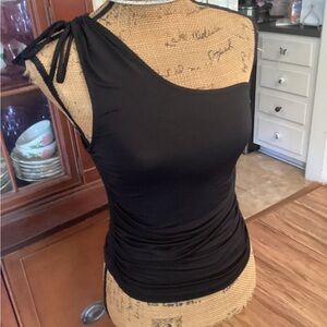 Chic one-shoulder camisole with a feminine tie-shoulder detail. Smooth, slightly ruched sides create a flattering silhouette. Stretch fabric offers comfortable wear. Versatile black top for day or night styling. Worn, good condition, bust 32” and 23” long.