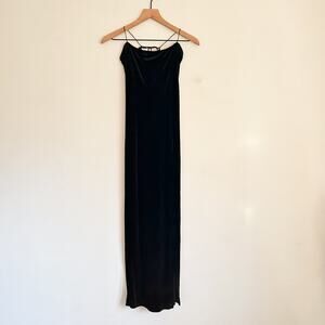 Embrace timeless elegance with Free People's Intimately All I Need Slip Dress. This luxe black maxi dress features a figure-flattering ribbed velvet construction that drapes beautifully. The sleeveless design and open back add a touch of allure, while the daring side slit offers a glimpse of leg. Perfect for a night out or a special occasion, this luxurious dress makes a lasting impression. Appear to be small rip at the top of slit- see pictures. No other noticeable flaws.