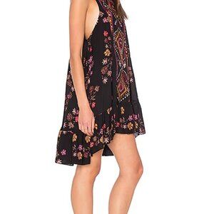 An eclectic, floral-print Free People dress in an effortless silhouette. A small cutout opens the back, and a ruffle trims the hem. Sleeveless. Unlined.