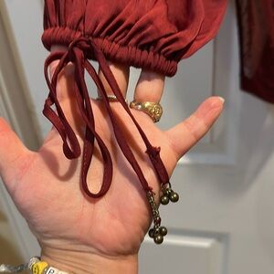 Gently worn Free People Intimately Another Round Burgundy Satin Peasant Bodysuit women's size medium. Polyester/elastane blend, burgundy, square neckline with smocking in front, elastic at top of shoulders, long sleeves- poet style with adjustable tie at wrists, bells on ties, thong style bodysuit, snaps in crotch. Offers accepted!