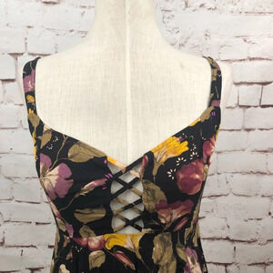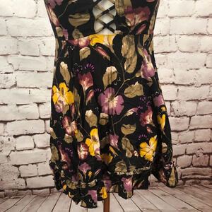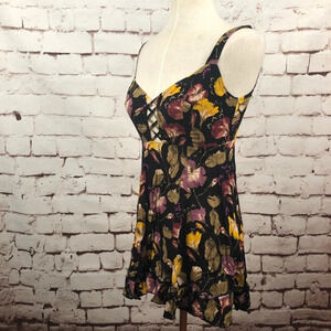Free People Intimately Black Floral Chemise Dress. Black Chemise dress with allover floral and leaf print in green, yellow, and pinkish purple. Wide straps with crisscross neckline. Smocked detailing at back. Ruffle hemline. 100% rayon.