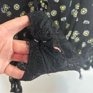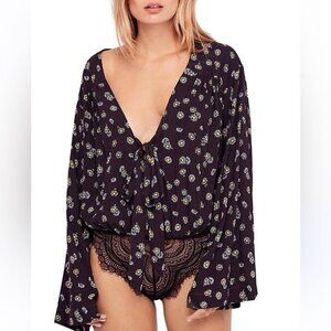 Free People Intimately Black Floral Long Sleeve Deep V-Neck Bodysuit Size Small