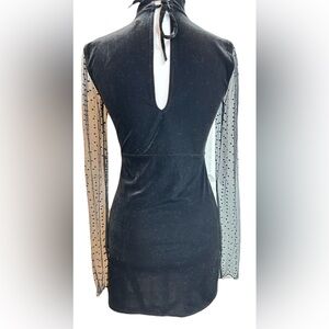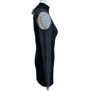 Chic black dress with sheer polka dot sleeves. Intricate front detailing. Ideal for stylish outings.
