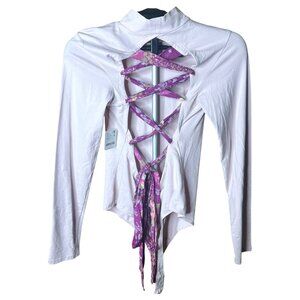Features: Lace-up open back with floral ties, mock neck, stretch fit