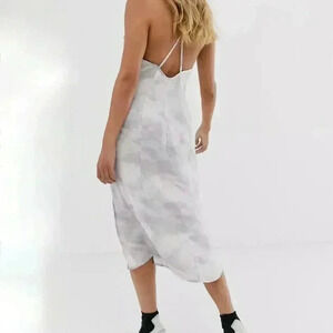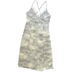 This gorgeous silky (rayon blend) dress is midi length and features a side slit, hidden side hook/eye closure, subtle tie dye print, lace trimmed neckline and adjustable straps with back ring accent. White/gray and an almost lavender color.