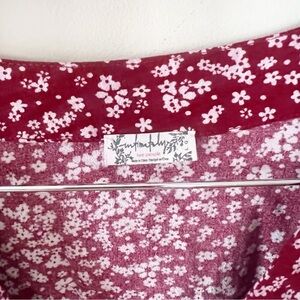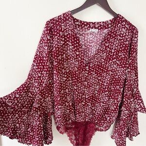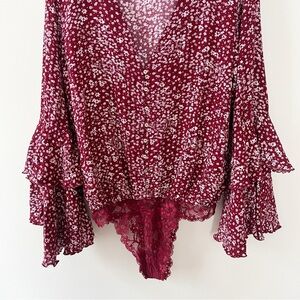 Excellent condition. Red maroon wine color. Floral print. V-neck. Statement tiered Ruffle wide long sleeves. Lace bodysuit with snap closure. Button Front.